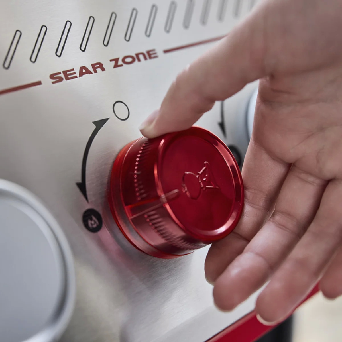 - Три основные высокоэффективные горелки, дополненные эксклюзивной зоной мгновенного обжаривания Sear Zone, обеспечивают беспрецедентный контроль температуры и мощность для создания идеальной хрустящей корочки на стейках;