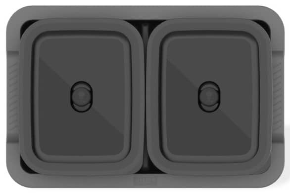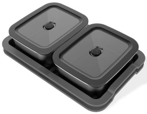 - В комплект входят два вместительных контейнера из нержавеющей стали с герметичными вентиляционными крышками и два разделенных сервировочных подноса, которые удобно складываются один в один;