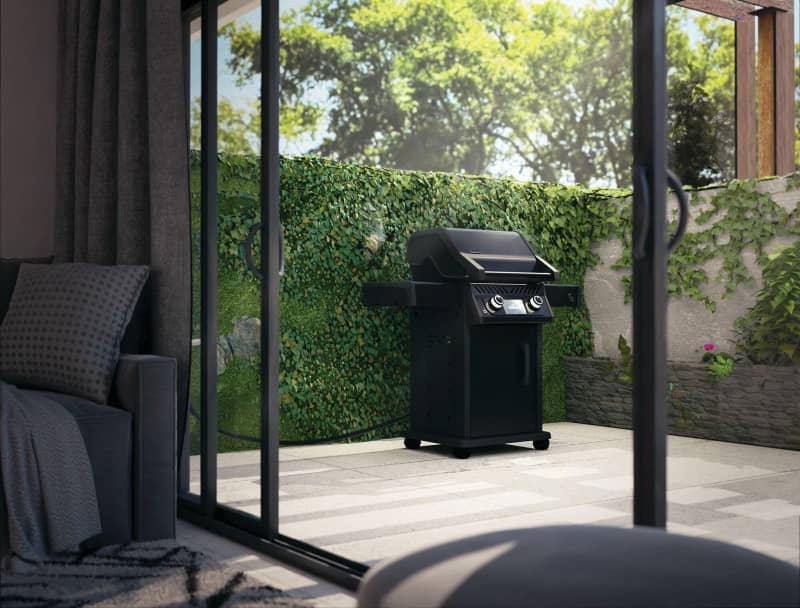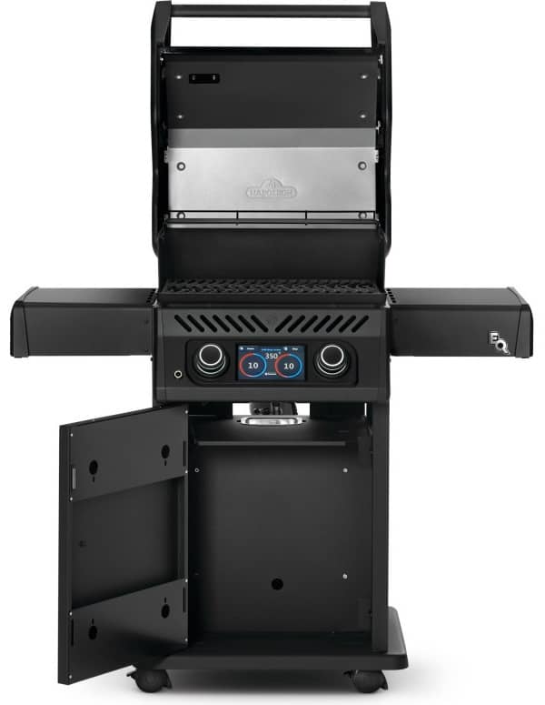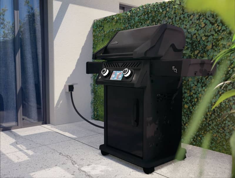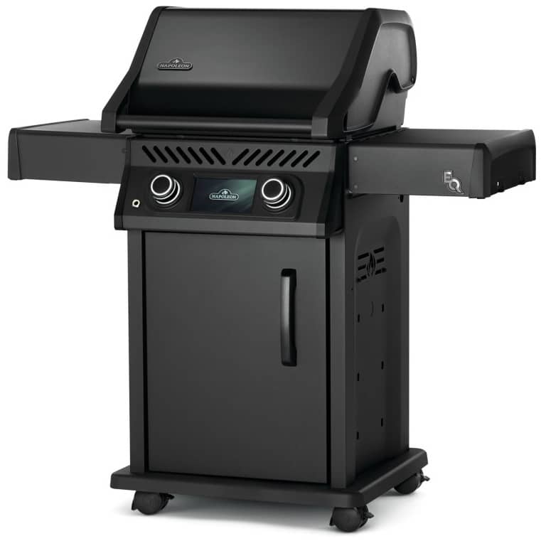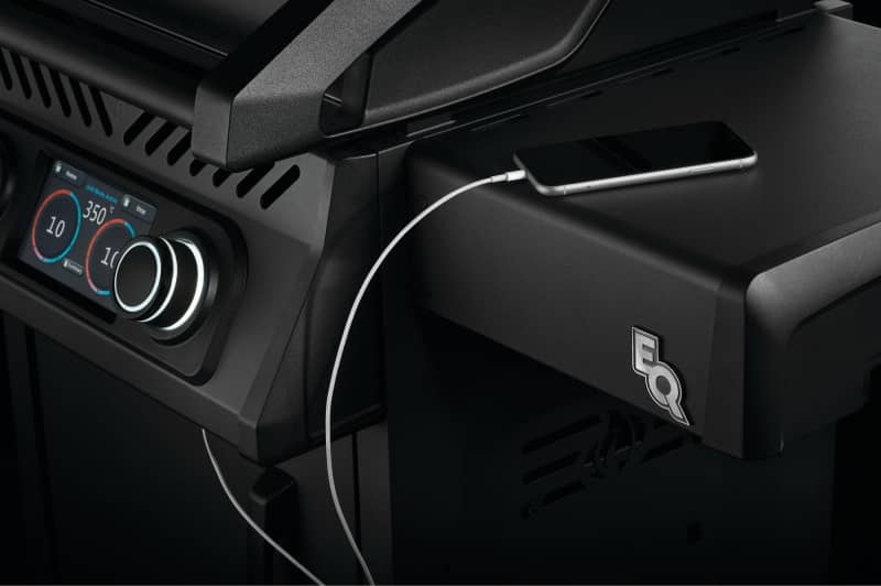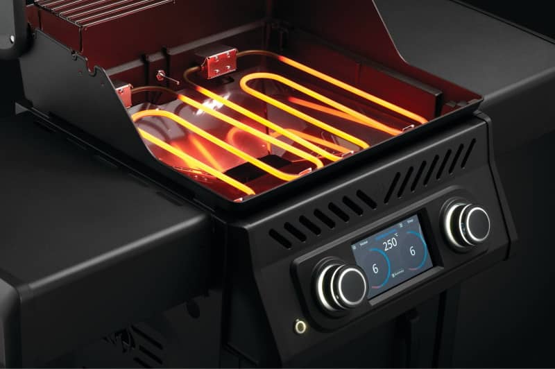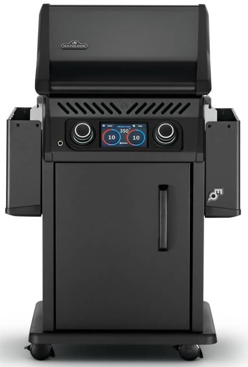 Мобильный электрический гриль Napoleon Rogue EQ 365 с двумя горелками, управлением через Wi-Fi, складными боковыми полками и регуляторами с подсветкой.