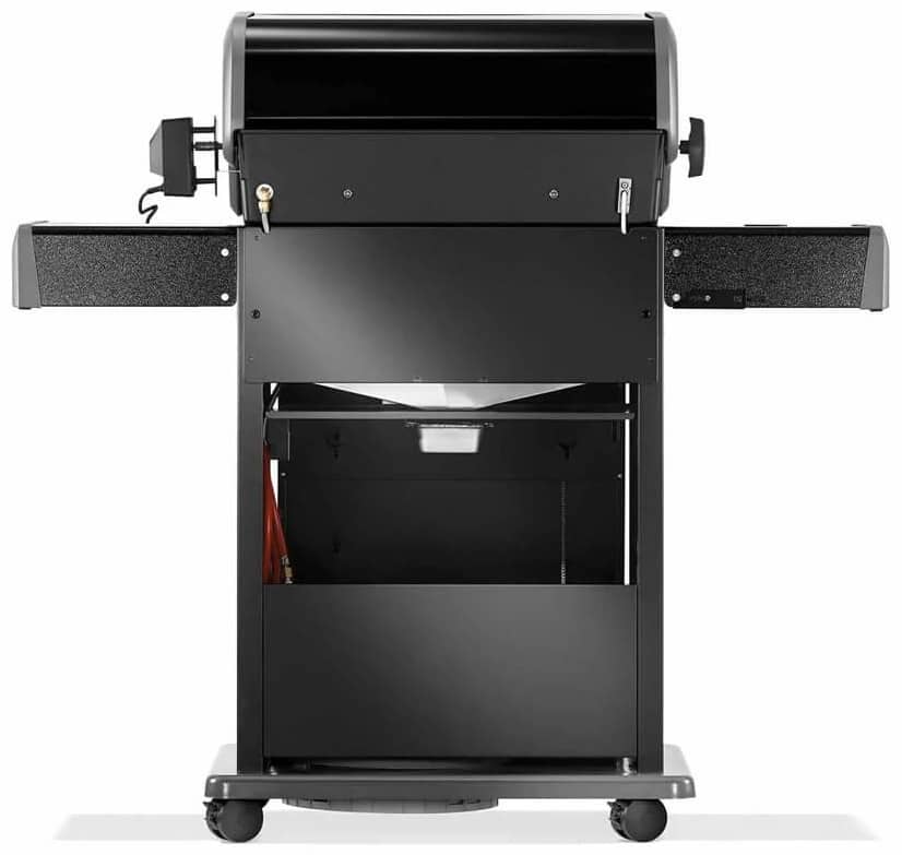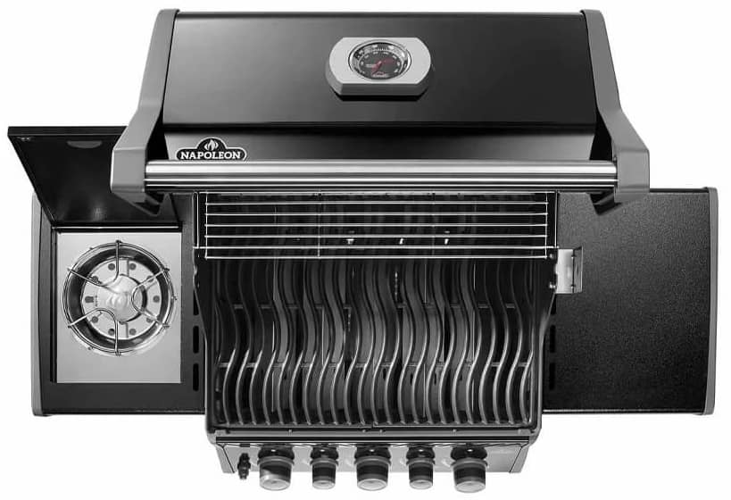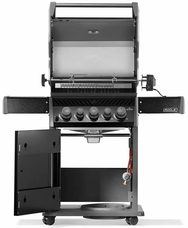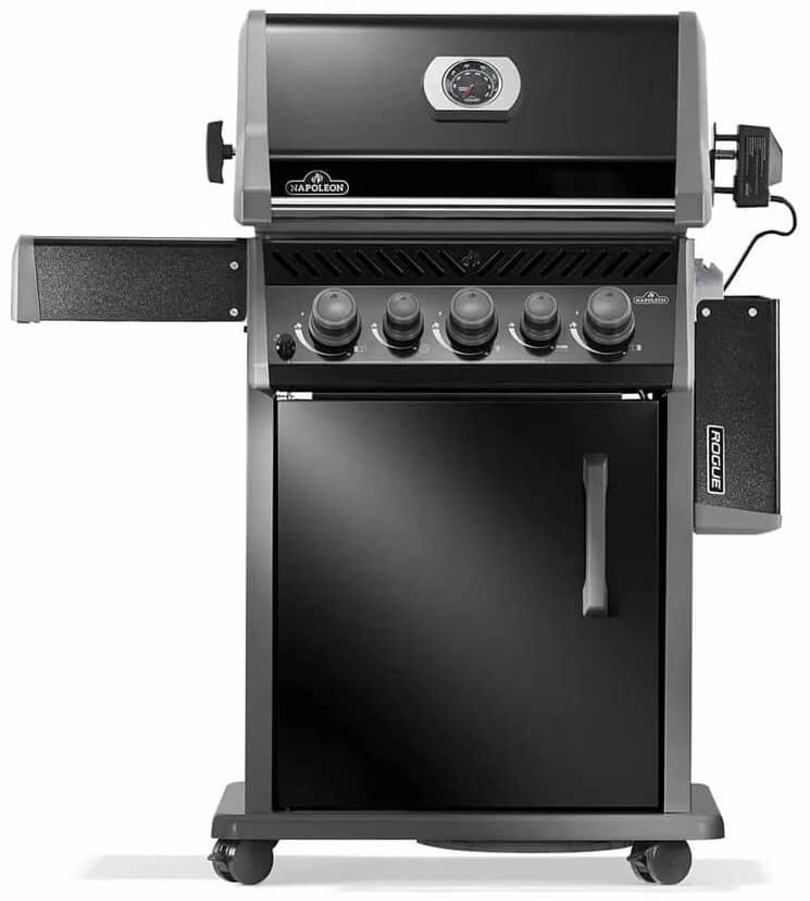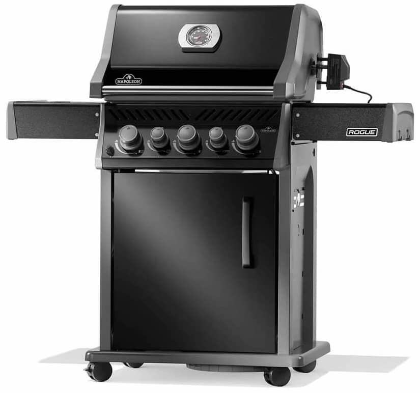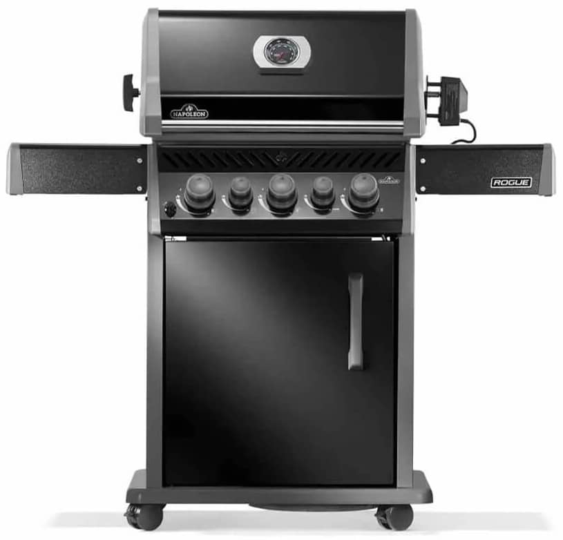 Мобильный газовый гриль Napoleon Rogue 425 в черном исполнении, на 5 горелок, задней горелкой, дополнительной боковой конфоркой, вертелом и встроенным термометром.
