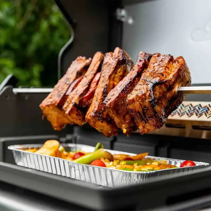 - Благодаря медленному вращению продукты сохраняют сочность, аромат и аппетитную золотистую корочку. Такой вертел отлично подходит для запекания целой курицы, индейки, шашлыка, крупных кусков свинины, говядины, а также рыбы;