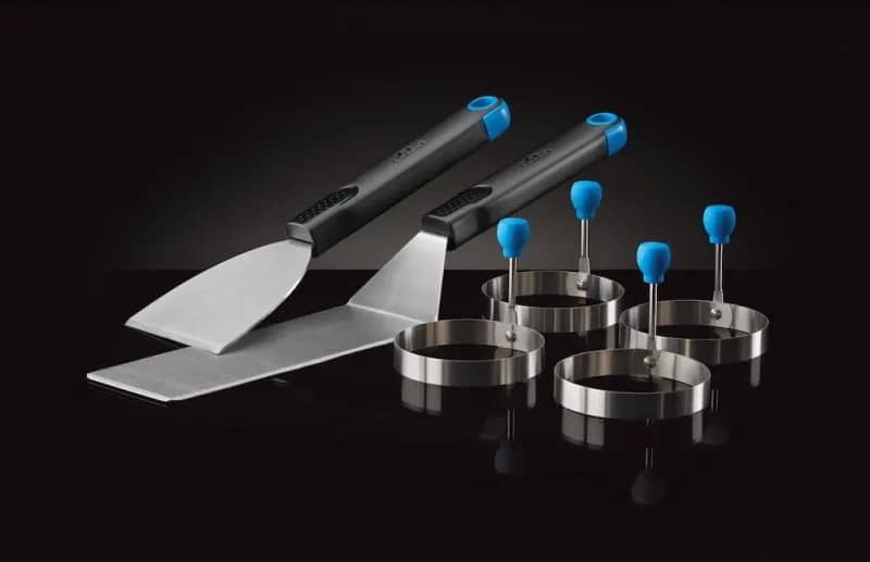 - В комплект входят 4 кольца для жарки яиц, удобная лопатка и скребок для очищения поверхности;