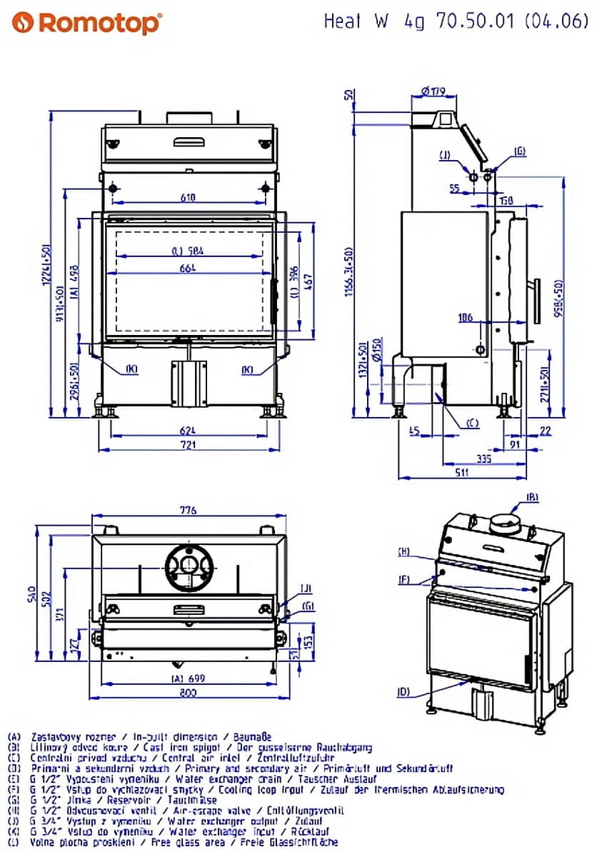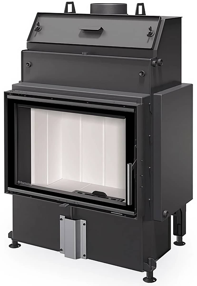 Каминная топка Romotop Heat W 4g 70.50.04 с водяным теплообменником, прямым стеклом, открытием дверцы в сторону и футеровкой из темного материала Igniton, рассчитана на интеграцию в системы отопления частных домов.